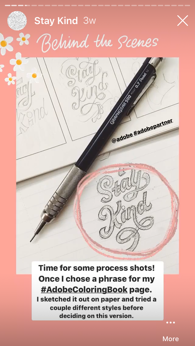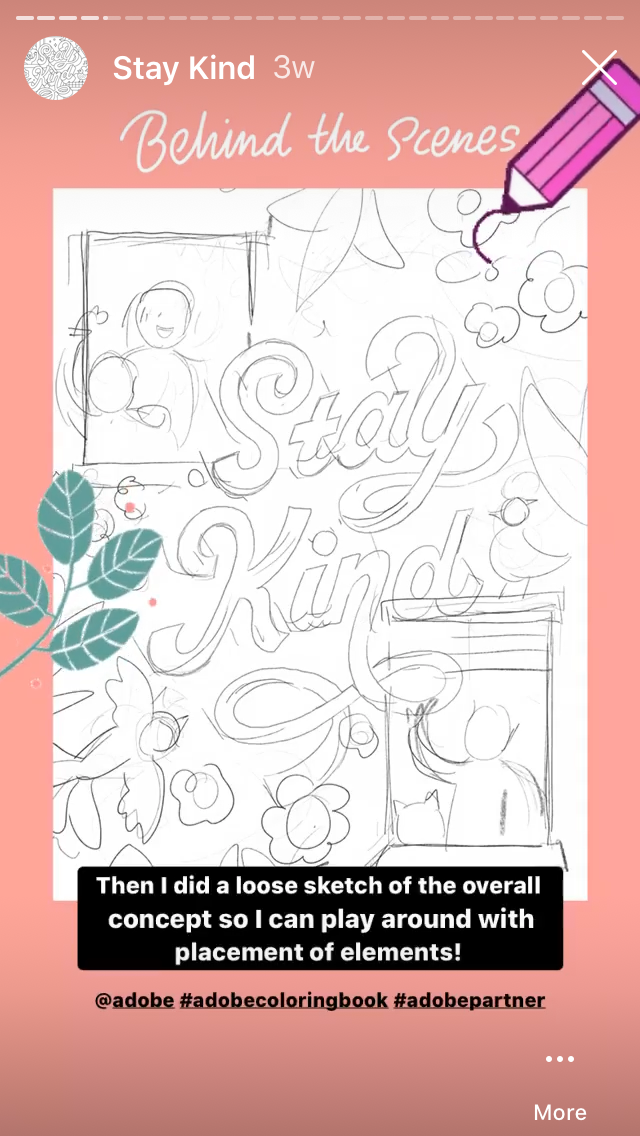 Custom coloring page illustration created for Adobe Create's Coloring Book campaign. My design was included in the launch of the coloring book (Chapter 1) along with art by Lauren Hom, Steffi Lynn, Sofi Bastos, and Kelli Laderer. As an Adobe Partner, the project included paid Instagram content to promote the coloring pages with the artist's own audience and to share behind-the-scene process.