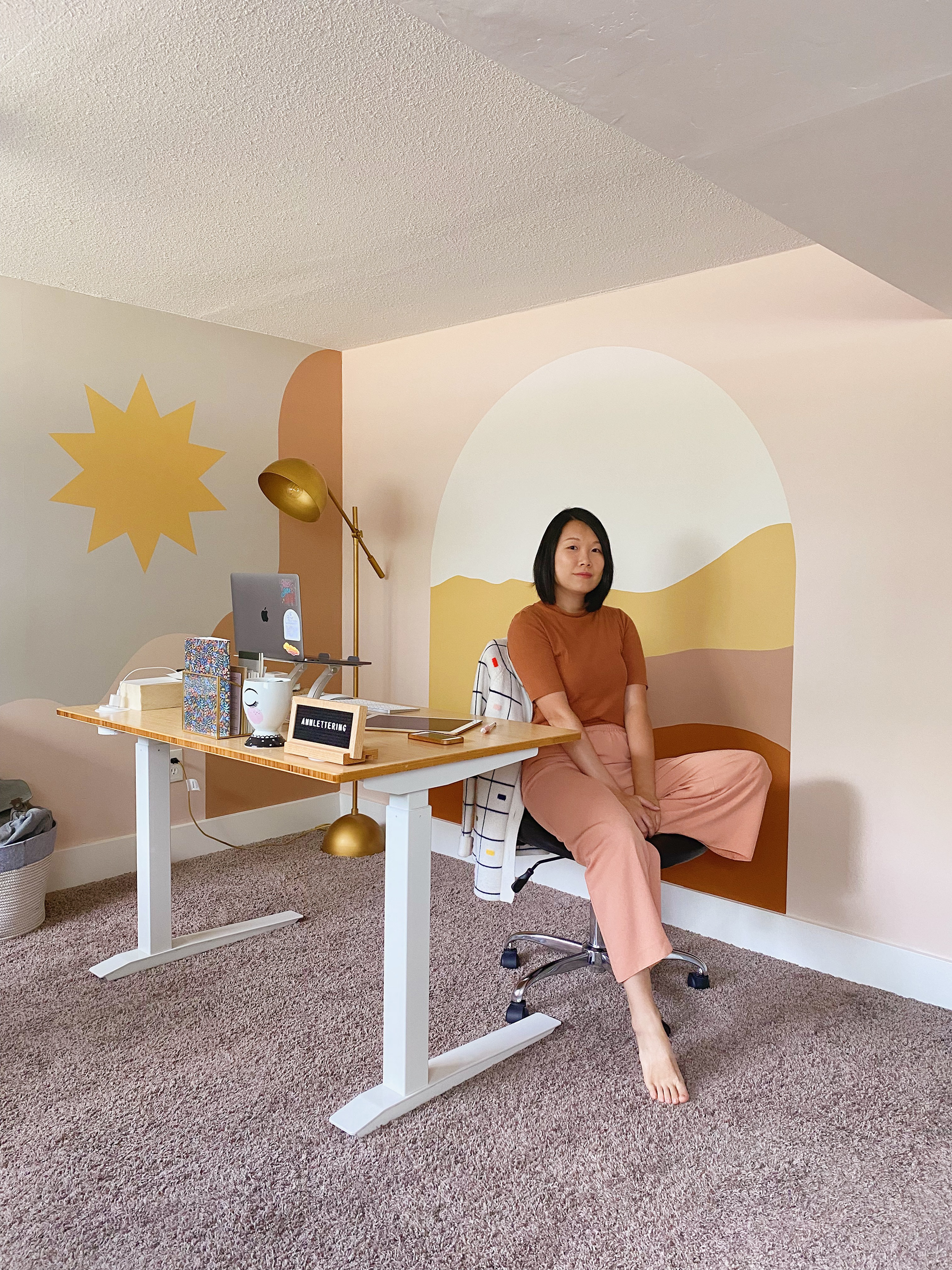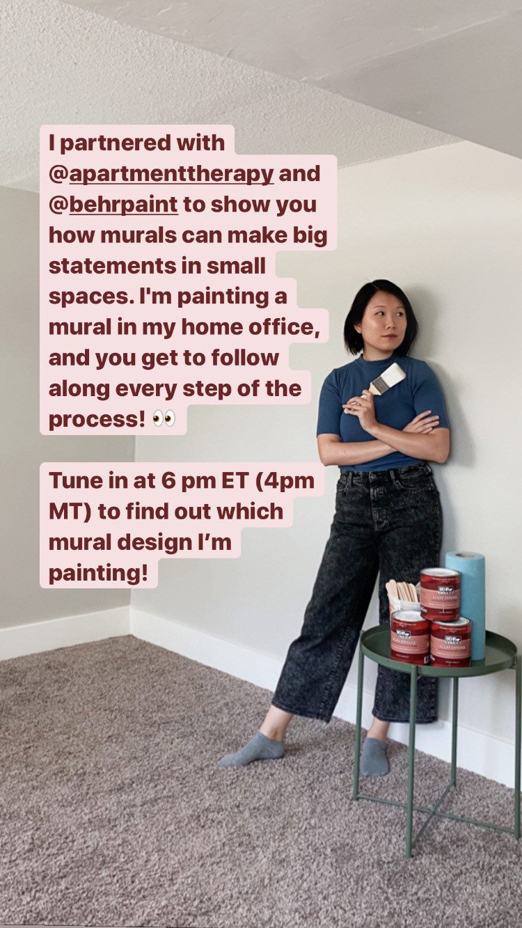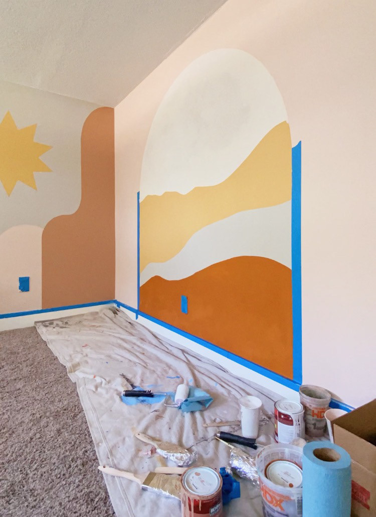 The mural is located in my home office with the design inspired by the arch trend and Utah deserts. I chose warm hues from Behr's 2021color trend lookbook to warm up my space with an inviting palette. I presented two unique concepts for Apartment Therapy's audience to vote through Instagram Story. The chosen design was painted over a weekend with multiple check-ins on Instagram Live where I shared painting tips and glimpse of the mural in progress.