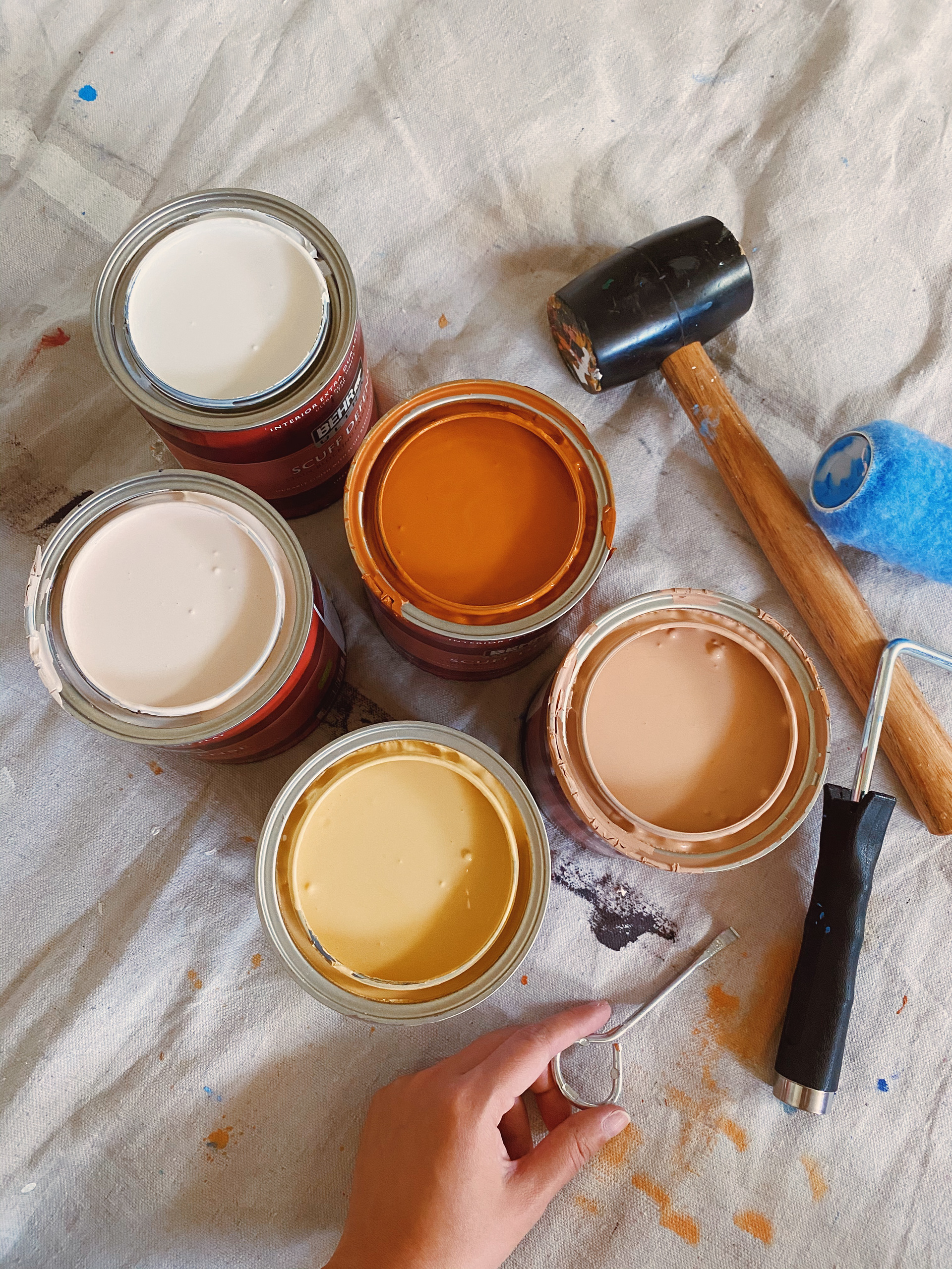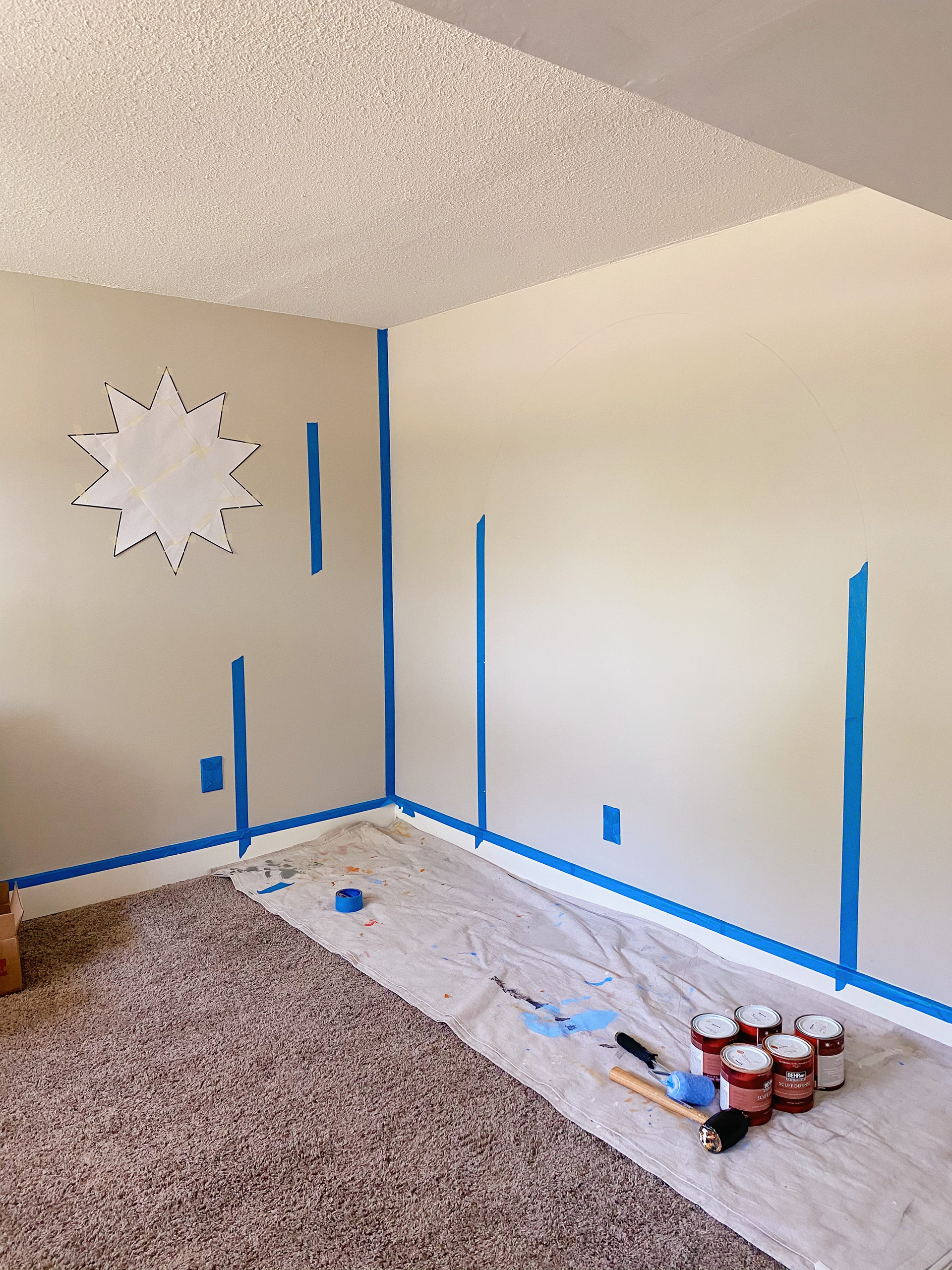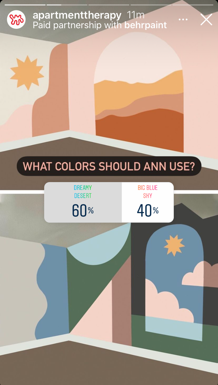 The mural is located in my home office with the design inspired by the arch trend and Utah deserts. I chose warm hues from Behr's 2021color trend lookbook to warm up my space with an inviting palette. I presented two unique concepts for Apartment Therapy's audience to vote through Instagram Story. The chosen design was painted over a weekend with multiple check-ins on Instagram Live where I shared painting tips and glimpse of the mural in progress.