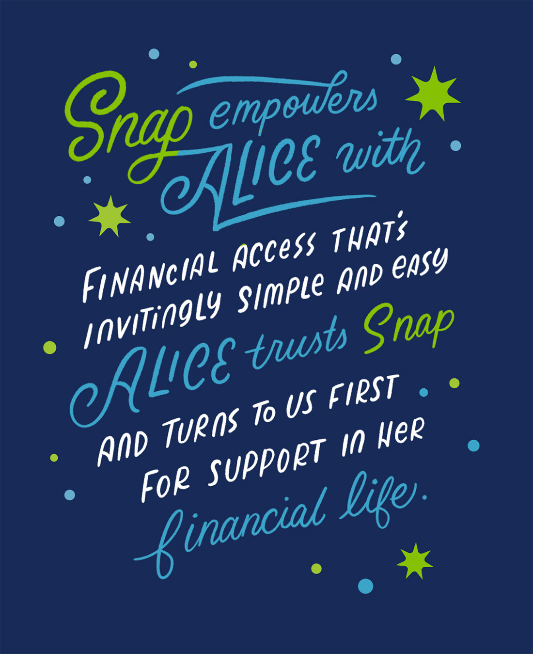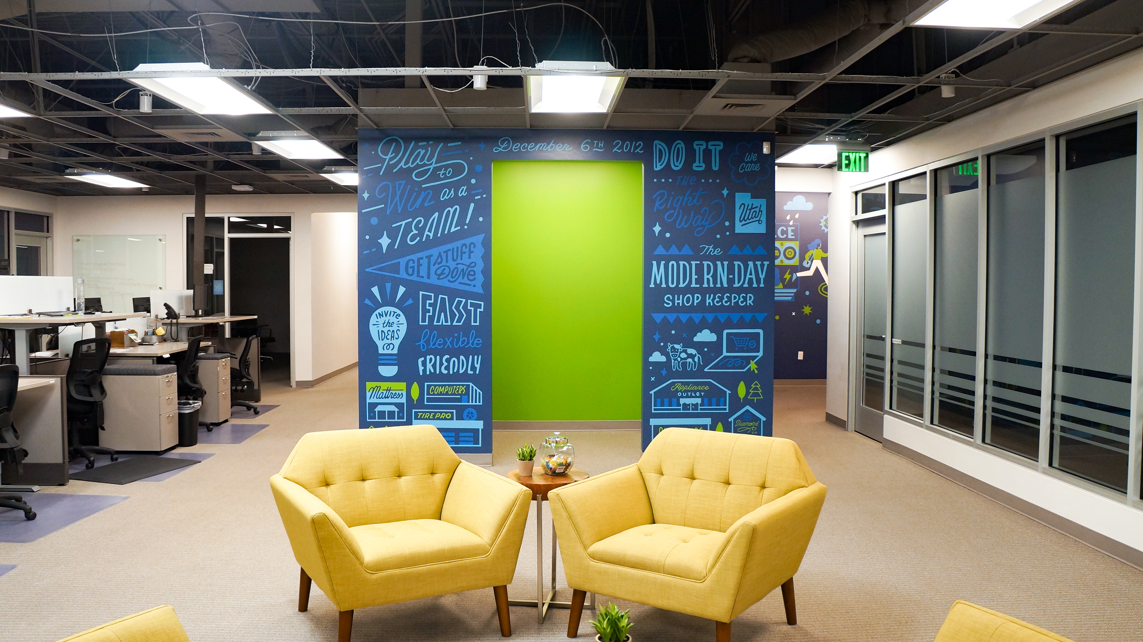 I was commissioned to paint three murals for Snap Finance's HQ in Salt Lake City, Utah. Snap Finance is the leading rent-to-own financing service for consumers in the electronics, auto, furniture, and jewelry space. The murals highlight their mission and core values through custom lettering and illustrations that reflect the friendly and people-first culture of the company.