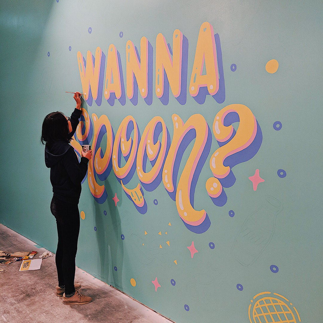Hall of Breakfast is an immersive pop-up experience, celebrating the most important meal of the day. Bigsley reached out to me to design two murals for their interactive art exhibit in Salt Lake City, Utah. This design is part of the breakfast cereal room and measures approximately 10 ft wide and 10 ft tall. The phrase is a cheeky play on words. My intention behind the design was to match the playfulness of the phrase through whimsical illustrations, as well as the tongue sticking out under the two O's that make up the eyes.