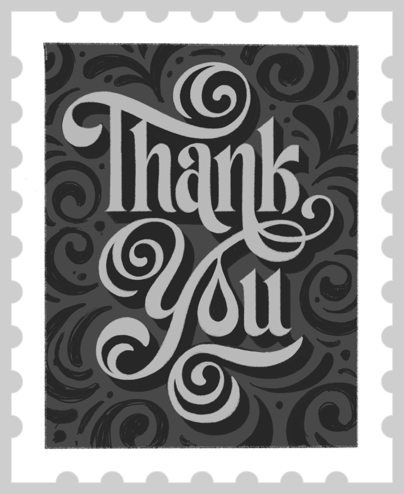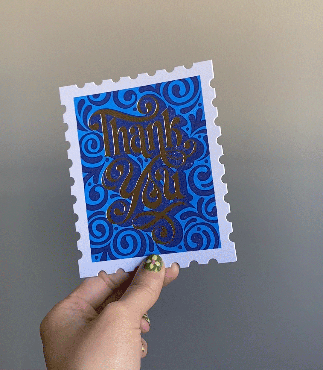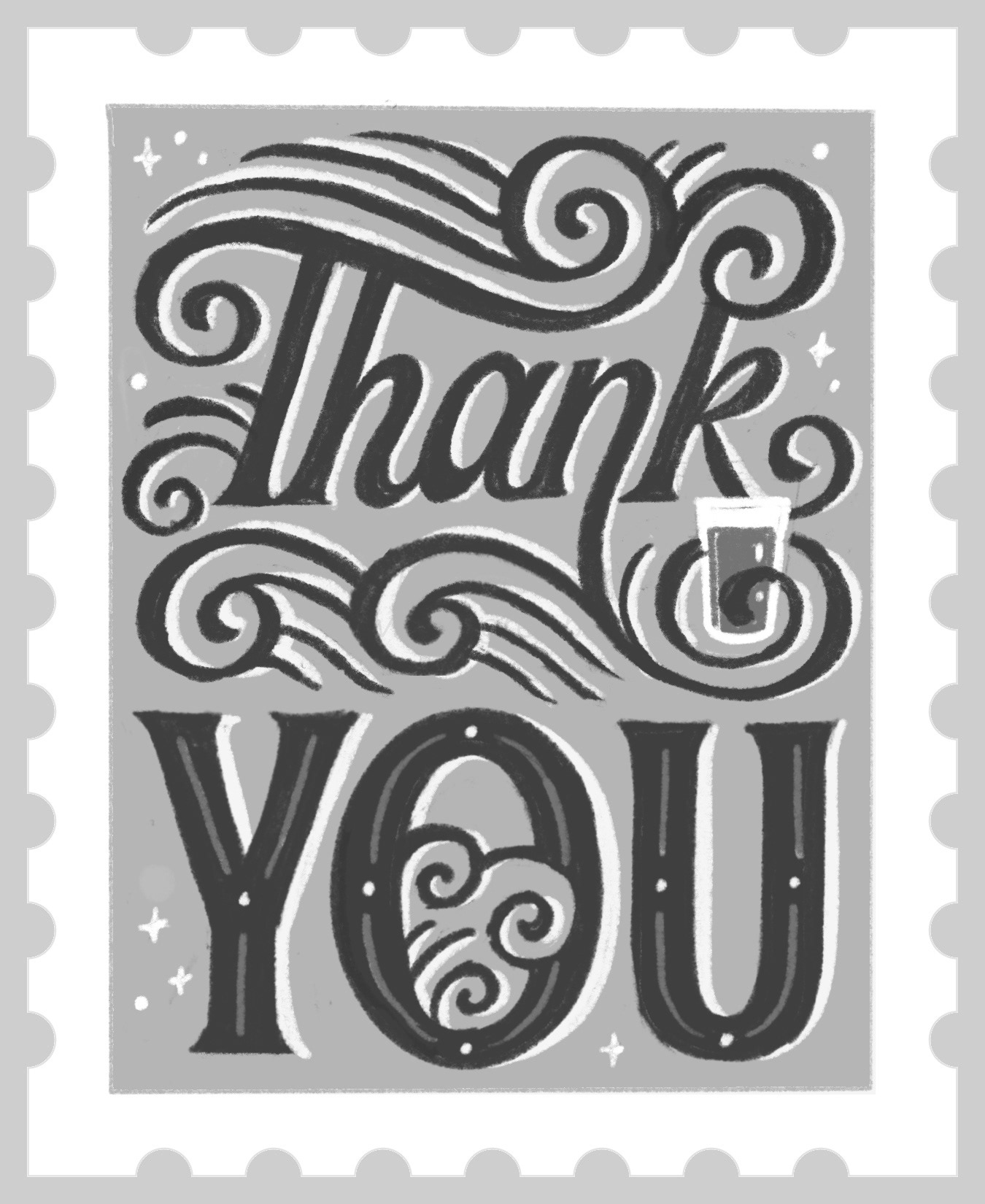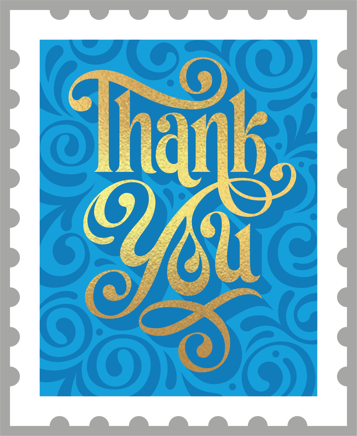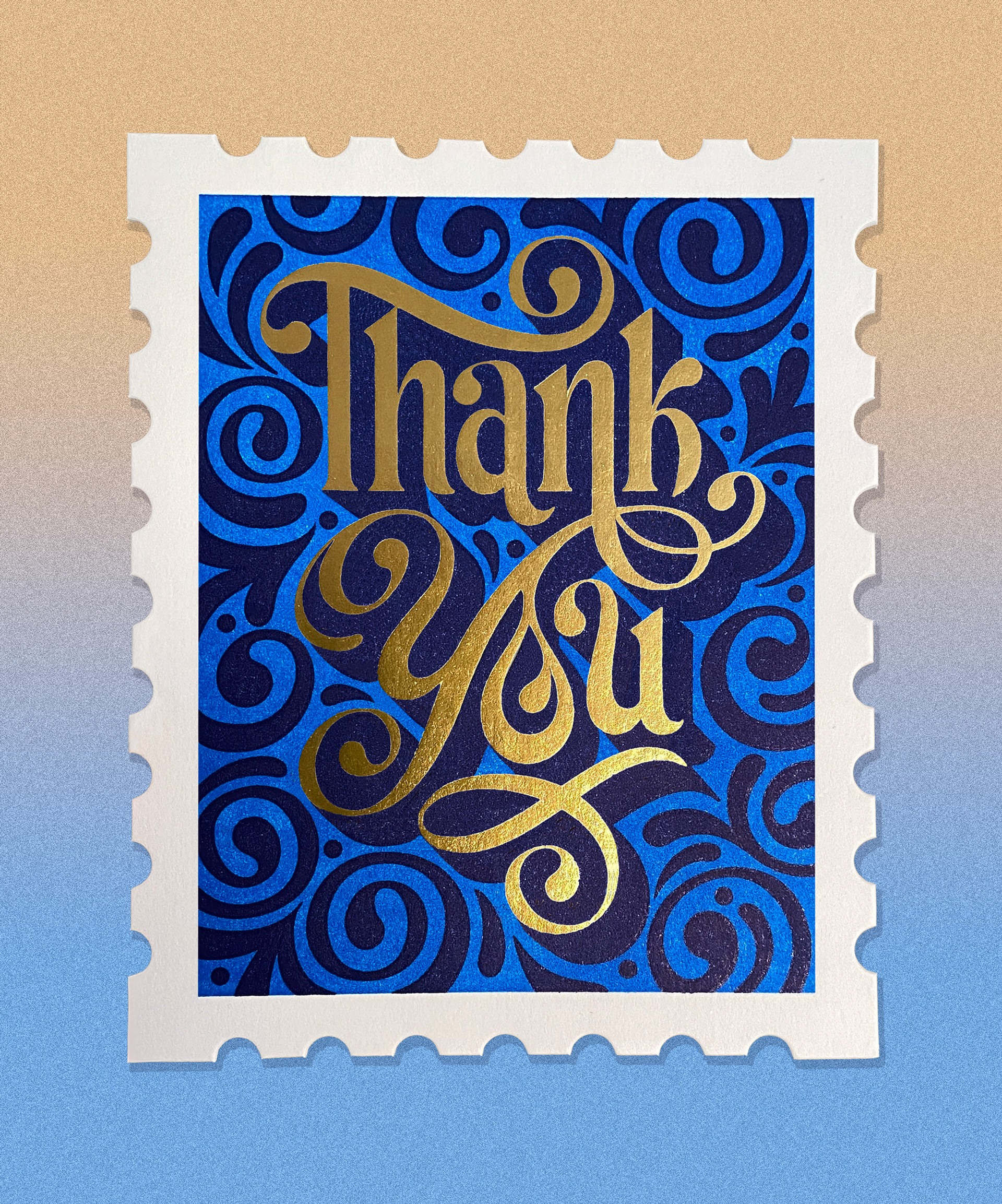 Custom serif lettering featuring the text "Thank You" on a scallop-edge card resembling a postal stamp. The artwork was letterpressed with a gold foil treatment to create a bespoke and elegant appreciation card for donors of Water.org.